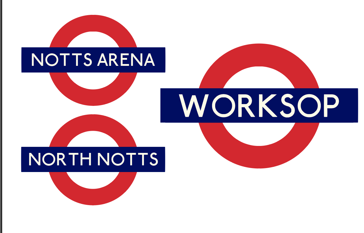 The Underground logo I found really caught my eye, so I used the colours of the logo and the font (which i downloaded from Here) to create one that said Worksop, North Notts (college) and Notts Arena